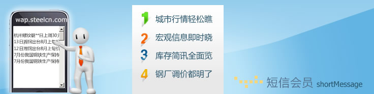 目前中鋼網(wǎng)手機(jī)短信能給用戶提供:每日全國(guó)各主要城市的板材、建材、管材、型材、鐵礦石、鋼坯、生鐵、廢鋼、進(jìn)口礦等行情短信信息,每日市場(chǎng)分析、熱點(diǎn)新聞分析、行情匯總信息、鋼廠調(diào)價(jià)、現(xiàn)貨供應(yīng)、現(xiàn)貨庫(kù)存、求購(gòu)信息、鋼材期貨信息等九大分類信息,為商家提供全面的信息支持。
